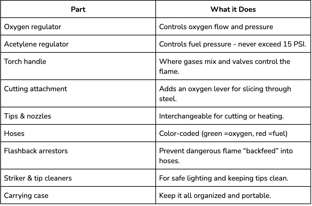If you’re shopping for your first acetylene torch kit, knowing what you’re getting (and what each part does) makes setup a lot easier.Here’s what a typical oxy-acetylene kit includes:
